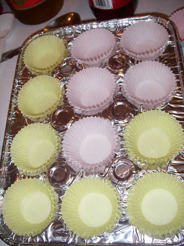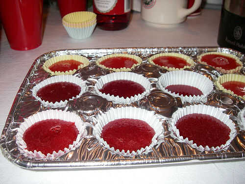 Las cacerolas de la hornada para cupcakes miniatura, con los revestimientos de papel, hacen moldes excelentes para tomas de gelatina (versión cocktail o cóctel sin alcohol). Los forros de papel facilitan el formar y servir lo Jello shots, y permiten quitar y manejar la gelatina sin tener que tocar la gelatina se