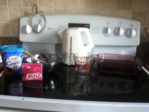 Esta es una divertida receta para hacer cuando la empresa o familia viene encima.Paso 1: Recoger los platos:Tazón medianoCuchara deTaza de medirmolde para hornear de 9 x 14 (no en foto).Paso 2: Recopilar ingredientes:Sabores de gelatina:Fresa, naranj