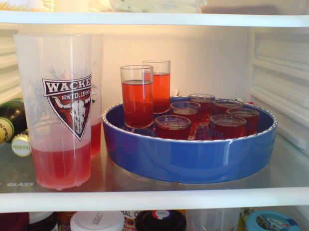 Vierta todo en sus gafas de tiro, y cuando usted los puede usar tazas de cerveza de plástico o cualquier otro recipiente. Poner todo en la nevera y espere un par de horas para él establecer.
