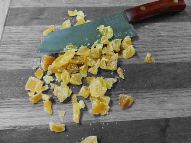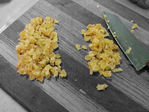 Usando el cuchillo y tabla para cortar, romper el jengibre confitado en cubos de 0,5 cm. Una vez allí, set la mitad a un lado y la otra mitad en aproximadamente la mitad se descomponen era (0,25 cm cubed).