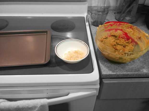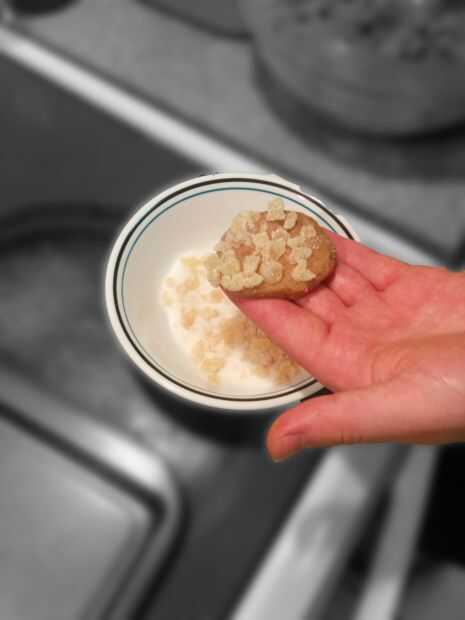 Una vez que ha decidido, porción de la cantidad correcta de masa y rodar. Prensa plana para las galletas más grandes y las tapas de las galletas en el azúcar y la mezcla de jengibre confitado de antes de la inmersión. Coloque en una bandeja para galletas sin enmantecar.