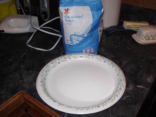 Pre calentar el horno a 350F y poner algunos o el azúcar en un plato.