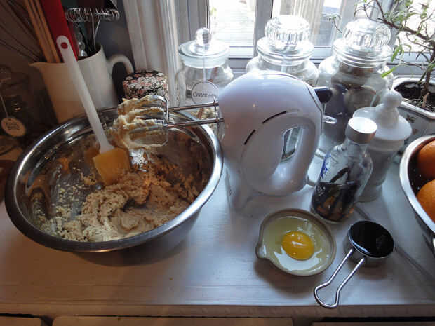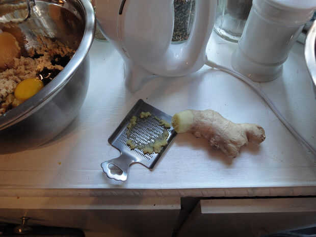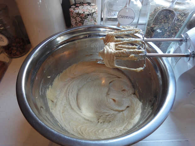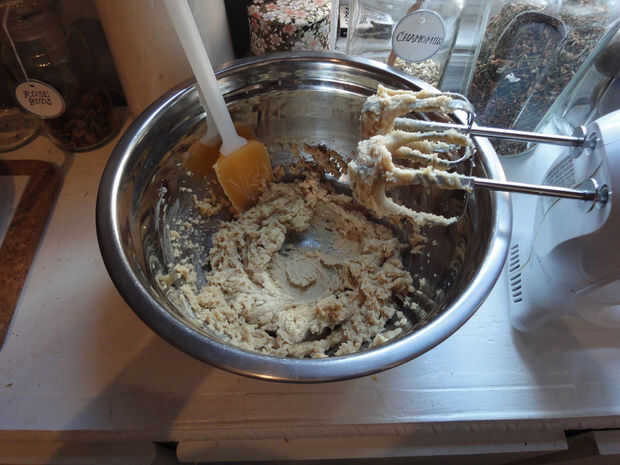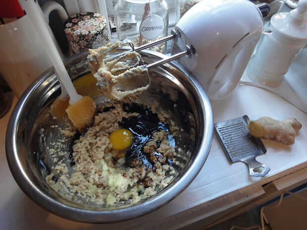 Bata la mantequilla y el azúcar a velocidad baja hasta que se mezcle bien. Luego agregar el huevo, la melaza y la vainilla. Rallar el jengibre y añadir que también. Batir otra vez hasta liso y cremoso.
