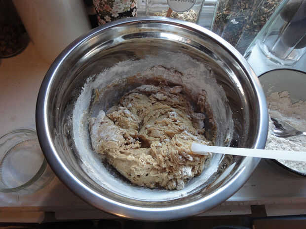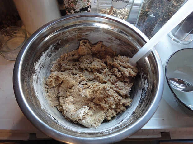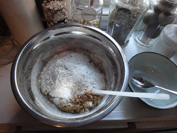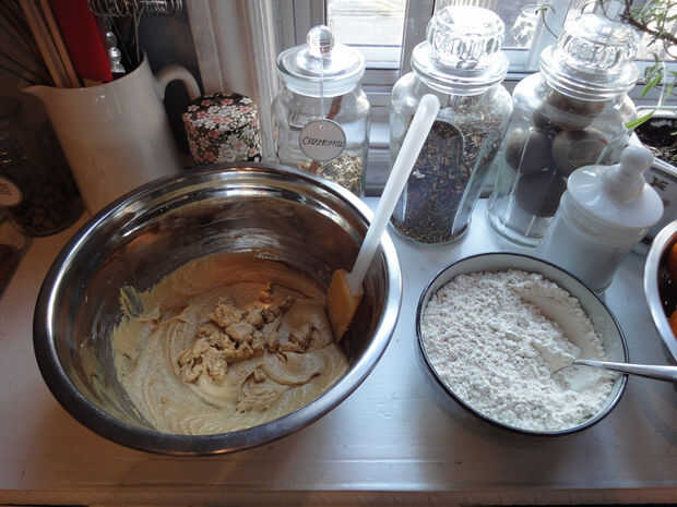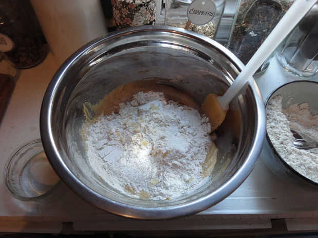 Añadir la mitad de la mezcla de harina y el jengibre picado a la mezcla de crema. Revuelva hasta que se mezcle. Agregar el resto de la harina y revolver hasta que se mezcle. Un poco de materia seca alrededor de los bordes es aceptable.