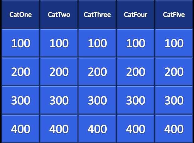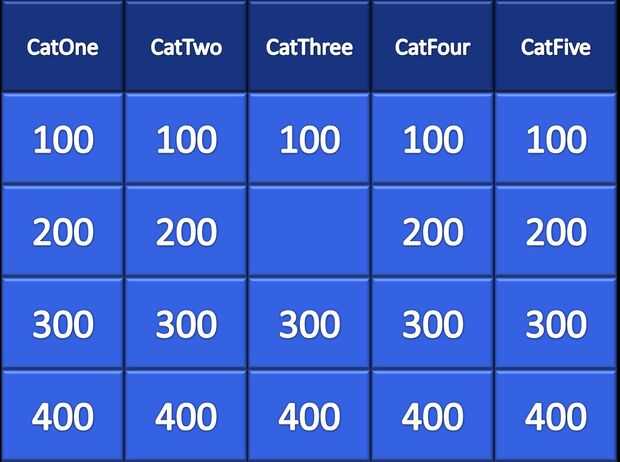 ¿Por qué hizo esto, no puede simplemente utilizar una de las muchas plantillas que ya están hacia fuera allí? Esto es cierto. Si haces una búsqueda rápida en internet, verá que usted puede encontrar muchas plantillas diferentes para un juego de Jeopardy. El problema para mí era que no me gustó ninguno de los que están disponibles. Parece que cada plantilla que se basa en el uso de hipervínculos a las diferentes diapositivas, que creo que imparte muchas limitaciones. La primera es que lo único que se puede decir que ha seleccionado una respuesta es que el hipervínculo es un color diferente (generalmente va de azul a púrpura). Os muestro un ejemplo de esto en la figura #2. Yo también quería tener un tablero de juego en el que el premio cantidad desaparecería si previamente habían sido seleccionado (ver cuadro #3 para mi versión). Un requisito final que tuve fue que esto tendría que ser relativamente fácil de usar, configurar y volver a utilizar en el futuro. No quería hacer algo que me acordaría de cómo utilizar venir 6 meses a un año por el camino.