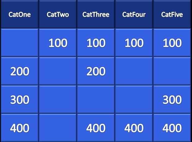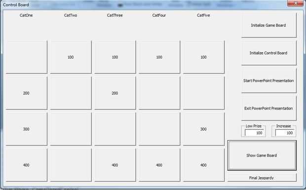 Cada vez que alguien pide una respuesta (es decir, CatOne para 300) haga clic en el botón correspondiente en la GameBoardControl. Esto le llevará a esa diapositiva. Después de esa respuesta, simplemente haga clic, "Mostrar tablero de juego" para volver al tablero de juego. Allí podrá ver que respuesta sólo hizo clic en ya no está disponible en el tablero de juego y la cantidad del premio también se ha quitado de la GameBoardControl! Cuando estés listo para ir a la diapositiva Final Jeopardy, sólo seguir adelante y haga clic en el botón de "Riesgo Final" en la GameBoardControl.
