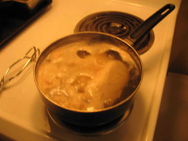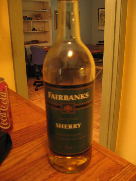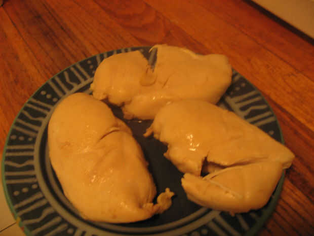 Poner las pechugas de pollo, Jerez y agua en una olla y llevar a ebullición. Reducir a fuego lento y cocine hasta que el pollo esté cocinado (15 minutos). Retire el pollo del líquido y colocar en el refrigerador para enfriar.