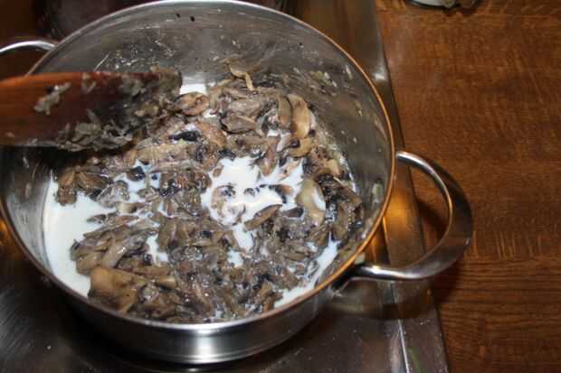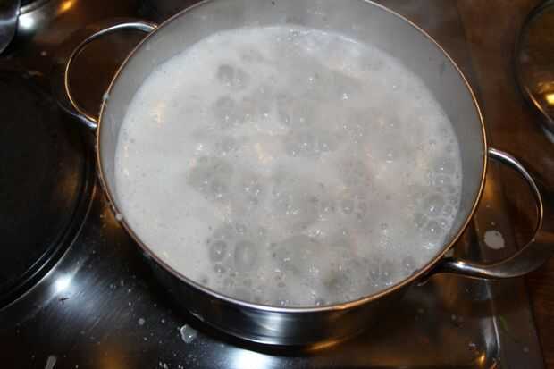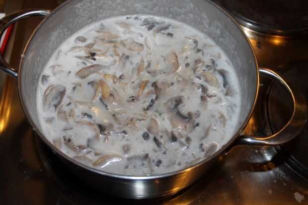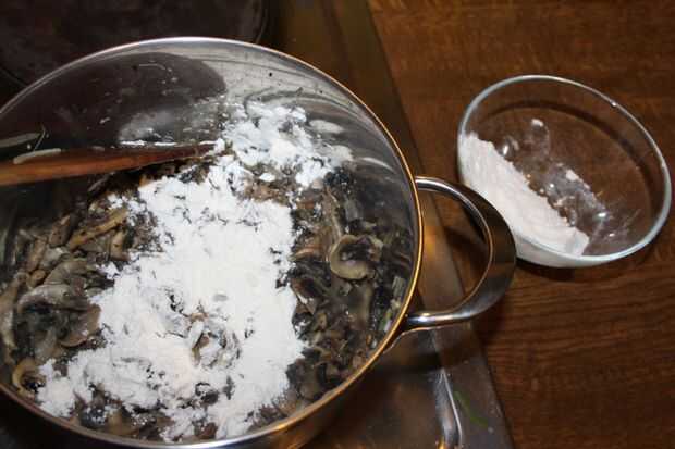 Agregue gradualmente la harina, se mezclan en la leche y el caldo. Llevar a ebullición, reduzca el calor y hervir suavemente durante 15 minutos.