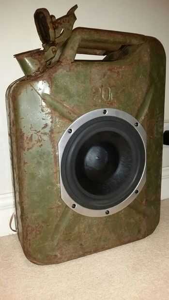 Algunos oradores de garaje nuevo con latas de gas de plástico y un kit de altavoces de 2 vías. Estándar 5L 1,25 gal gas latas Fit kit de woofer/tweeter de 2 vías 6.5" perfectamente. Como un bono adicional, el pico sirve para liberar la presión en la