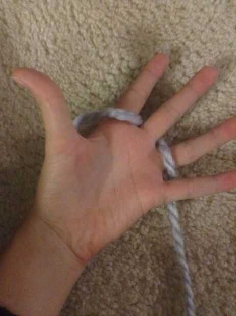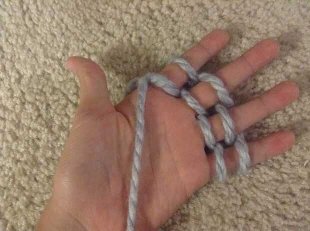 Tejido el hilo hacia dentro y hacia afuera los dedos hasta que tenga 2 bucles en cada dedo.