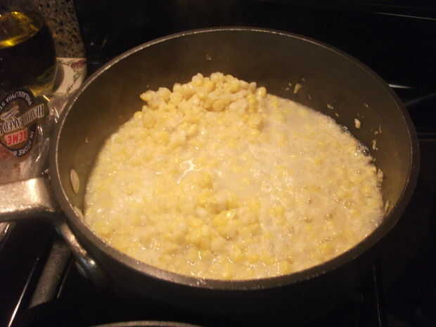 3. Agregue la harina y la leche a la mezcla de maíz.