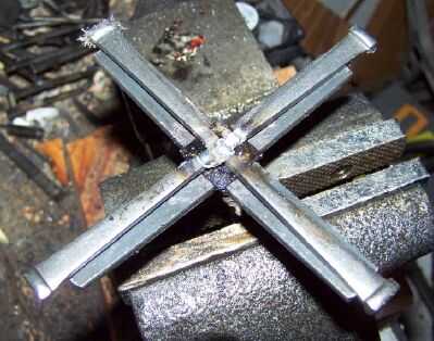 Aquí se puede apreciar el acabado eliminado de cruz grande en la plantilla, pero con las pinzas. Revise otra vez para asegurarse los cuatro clavos son 90 grados aparte de uno otro y que todo el conjunto no es plano, inclinados hacia arriba o hacia abajo en el centro. El calor de la soldadura ha suavizado las uñas bastante que usted puede hacer las correcciones, especialmente cuando la soldadura es todavía caliente. Los resultados serán bastante constantes, pero todavía varía un poco porque las uñas son a veces mas o menos amplio y todavía se colocan a mano, aunque hay una buena plantilla para servir como una guía. Algunas cajas de clavos están magnetizadas. (Observe la presentación de solicitudes en la cabeza del clavo en la posición de 10:00).