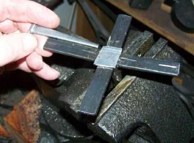 Está hecho de hierro de 1/8 x 1/2 pulgada correa. Una sola pieza de 4 1/2 pulgadas de largo es la parte principal. Dos alas 2 1/8 pulgadas de largo cada una están soldadas a él a 90 grados para hacer una "X". (Una de mis alas no es bastante de 90 grados a la pieza principal. Por lo tanto, tuve que agregar marcas de puntuación de los cuatro brazos para definir la posición exacta de las uñas antes de soldar. Algunas de las marcas de puntuación son visibles).