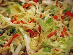 Drenar la mezcla "Seca" (la sal extraerá el líquido de la col). Revuelva el enfriado mezcla "Húmeda" en la mezcla "Seca" hasta que las verduras están bien cubiertas.
