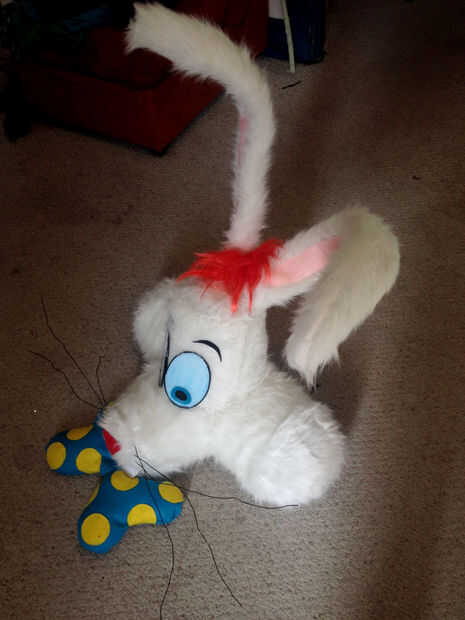 Un poco de pelo rojo de una peluca se utilizó para su cabello, un diente de fieltro, nariz, cejas y boca detalles junto con pedazos de cable para los bigotes para acabar con. Tenemos que tener cuidado con esos bigotes si fueran peligrosos durante toda la noche!