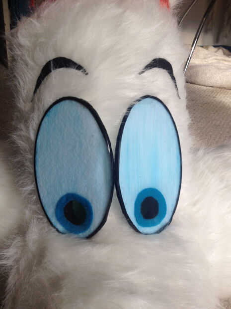 Los ojos fueron hechos con piezas redondeadas de cristal que teñido azul y círculos de fieltro cortados y pegados a la cabeza por debajo, con agujeros en la cabeza en el centro de los ojos para ver a través.