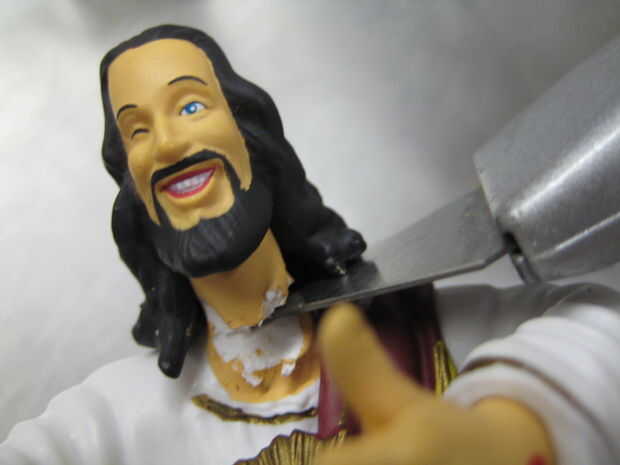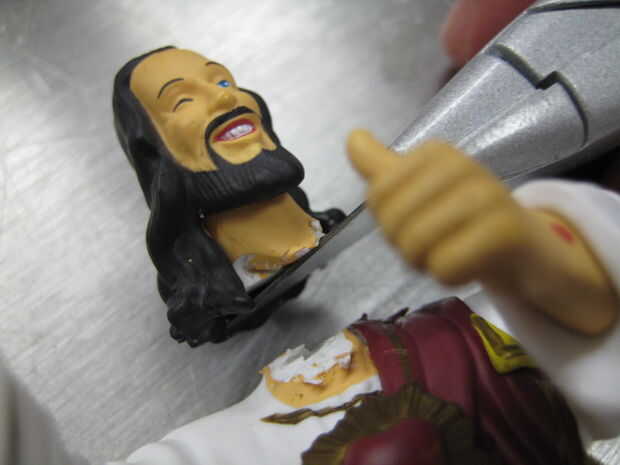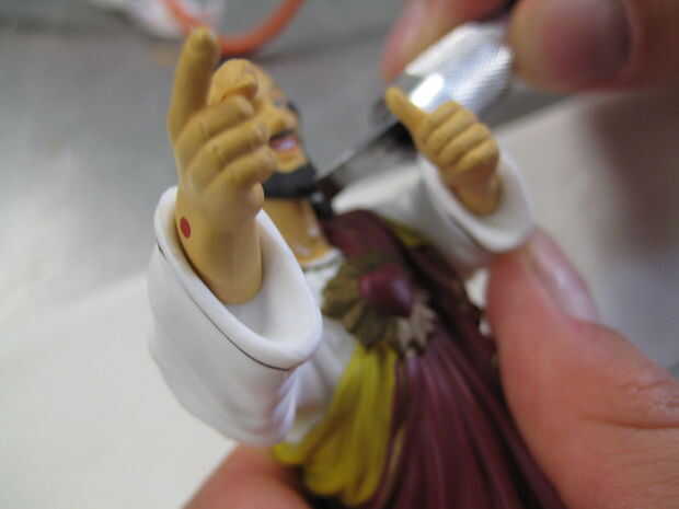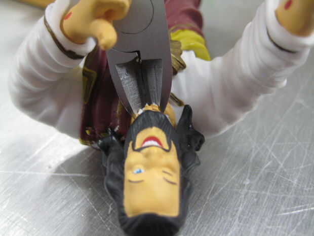 Cabeza de Jesús estaba mucho menos dispuesta a pop que el bebé, por lo que necesitábamos para llevar a cabo un pequeño procedimiento quirúrgico. Usando un boxcutter y unas tenazas, corte e IMPLICITAS alrededor hasta que su cabeza cayó.
