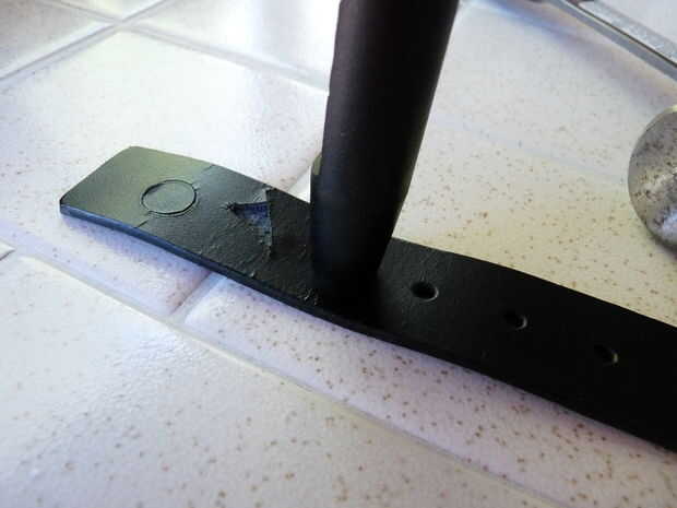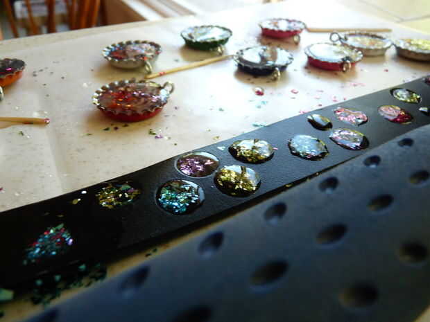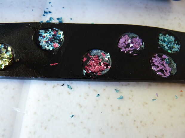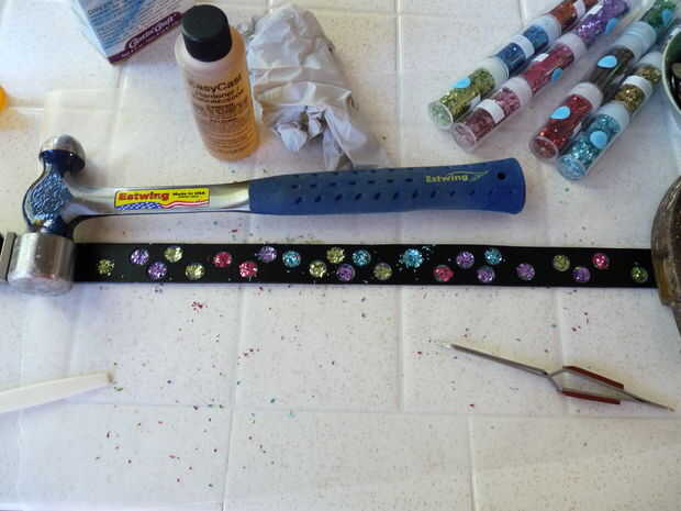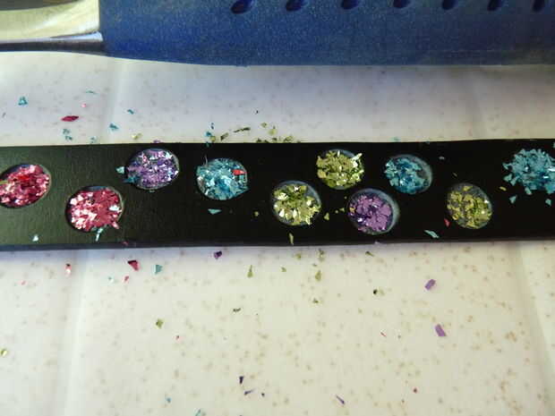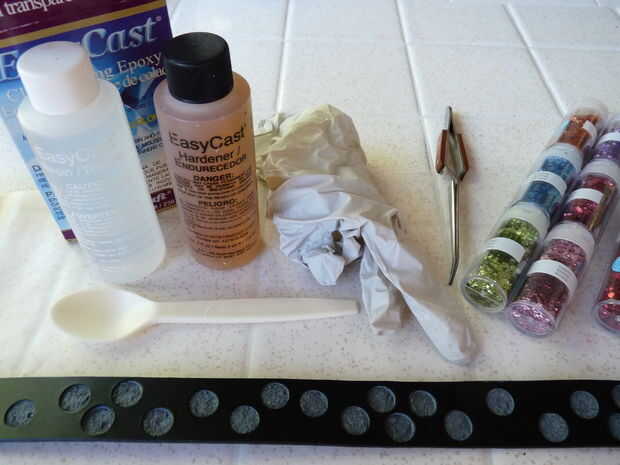 6) ponga cosas pesadas en el collar para que sea tan plano como sea posible. He usado martillos. Luego vierta un pequeño goteo de epoxy en cada orificio y mézclelo con el brillo. Utilice un palillo para mezclar.