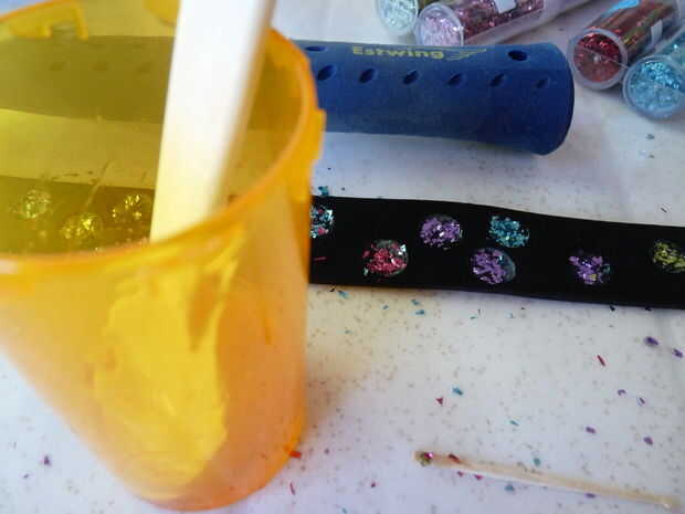 (Yo usé un brillo muy grueso. No creo que funcionaba así como brillo fino que he utilizado en otros proyectos. Usaré brillo fino o polvo de color la próxima vez que lo hago.)