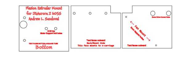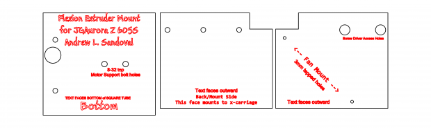 Utilice la plantilla para perforar los agujeros en la Plaza de aluminio en una prensa del taladro. Asegúrese de utilizar las brocas derecho--sobre todo en los agujeros roscados se requieren. Usé 8-32 para los pernos de soporte del motor. Utilizar lo que tengas en mano para eso. El ventilador que se incluye con el JG Aurora Z 605S se une en el soporte original con dos tornillos de 3mm. También puede utilizar tornillos de 4mm (cabrán a través de los orificios de montaje de ventilador) si prefiere. Sólo recuerde perforar los agujeros del tamaño adecuado para el grifo que va a utilizar. Los orificios restantes se utilizan sólo para pasar cosas a través. Para mí, creo que utilicé una 5/32 broca para los orificios a través de la cual un perno de 3mm pasaría, así como por los agujeros usados para sujetar el soporte a X-chasis. Utilizar lo que es más cercano al tamaño de la plantilla. Y, para los orificios de acceso de controlador, lo suficientemente grande para su husillo conductor caber fácilmente. Usted puede hacer sin esos agujeros, pero será más fácil unir el soporte a X carro con ellos allí.