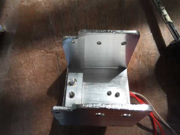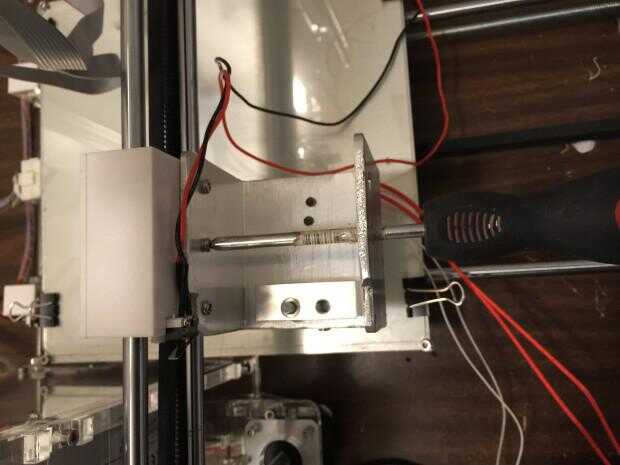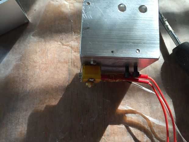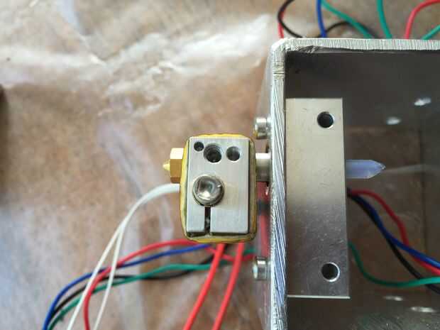 Siga las instrucciones de la Página Web extrusora de flexión para montar el hotend - Recuerde que el cañón debe pasar por la parte inferior de la montura que nos acaba de hacer. En este paso (montaje de la hotend), usted tendrá su cartucho calentador tu termistor k 100 y algunas cintas de kapton. Es más fácil de instalar el cartucho calentador (y apretar el conjunto tornillo) primero. Luego inserte el termistor en el agujero más pequeño. Se puede utilizar con cuidado el tornillo proporcionan para trabar el termistor, pero es muy fácil dañar los cables. Compré un set de 5 y ya han arruinado 2 creación de esto. :) Utilice cinta de kapton para ayudar a sostener los cables del termistor a los cables de calentador y mantenerse lejos de la placa de construcción.