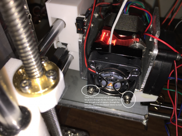 Uso el ventilador, disipador, original pernos, arandelas y protector del estirador viejo para montar el motor paso a paso (y Extuder) para el bloque de montaje adjuntan al Monte como parte de la Asamblea de la hotend. (Véase las fotos). Esto completa el accesorio de la extrusora.