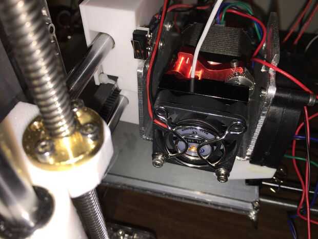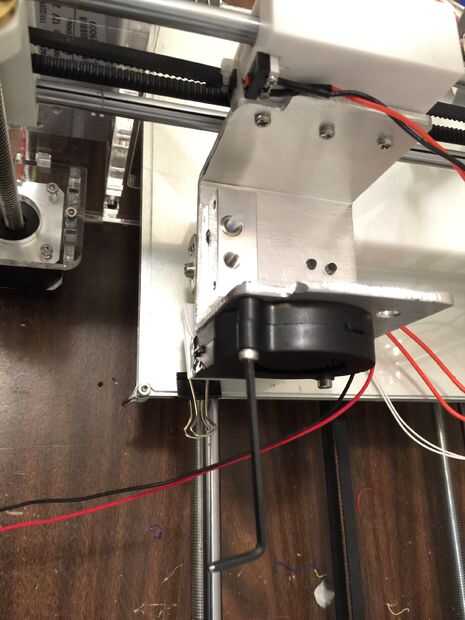 Por último, utilizando el hardware original, montar el elemento ventilador en la parte delantera de la montura, con la boquilla direccional apuntando justo debajo de la boquilla. (Nota: como se muestra en la foto de este paso puede ocurrir en cualquier momento después de instalar el Monte en el carro X.)