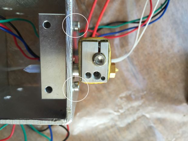 Utilice dos tornillos de 3mm corto para conectar el hotend ahora montado al Monte. Esos dos agujeros en la parte inferior de la montura en los lados del agujero del cañón existen para este propósito.