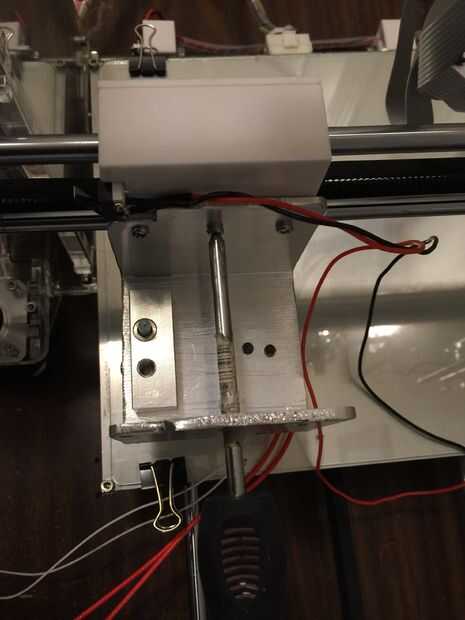 Ahora puede conectar el Monte en el carro de X. Puede utilizar los orificios de acceso de controlador en la parte delantera de la montura para ayudar a instalar los tornillos (los mismos tornillos que sostienen el antiguo Monte de extrusora en pie) por el Monte y en el X-carro de plástico.