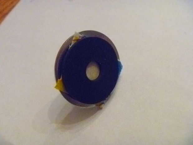 Doble conducto de cinta por lo que se vuelve pegajosa en ambos lados. Coloque la cinta en el centro de la arandela de goma. A continuación coloque arandela de goma al centro de la arandela de metal.