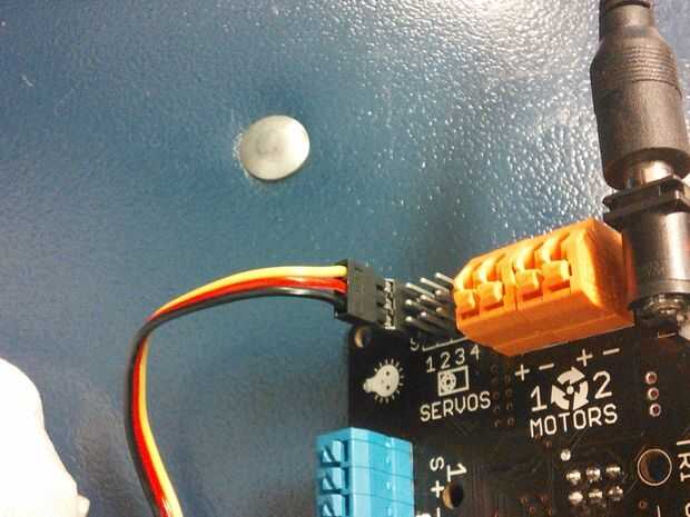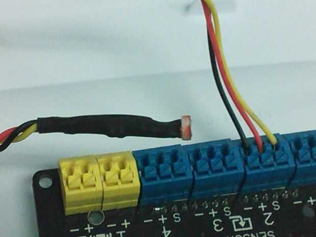 En primer lugar, poner los cables del sensor de luz en los bloques azules con el negro delante el signo negativo (-), el cable amarillo frente a la "s" y el cable rojo por el signo más (+). Inserte el servo poniendo el cable sobre las espigas de pequeños diámetro necesario de energía.