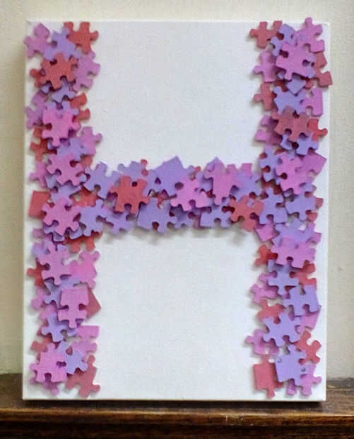 Hola, soy Hazel y soy una chica de la fábrica. Tuvimos un rompecabezas con pedacitos de falta y en lugar de tirarla, desafió a ver qué podía hacer con él! He creado este arte de la pared para poner en mi dormitorio. Si utilizas tu inicial para los propósitos decorativos se llama un monograma. ¡ Amo mío! Usted puede utilizar cualquier color, elegí color de rosa y púrpura para que coincida con mi dormitorio. Esto no es difícil de hacer pero se ve muy bien!