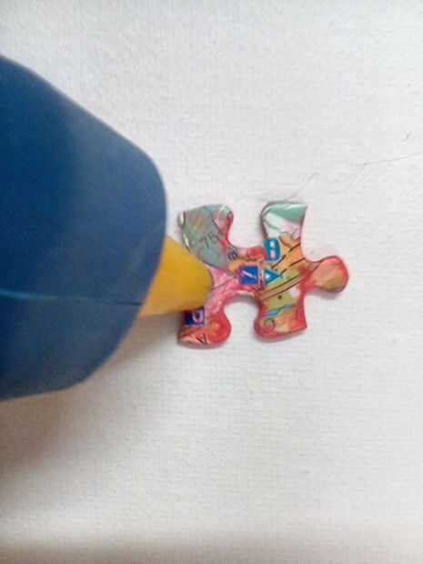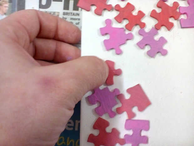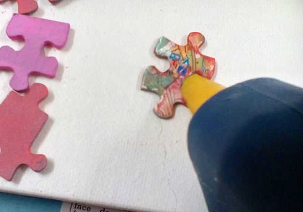 Comenzar a pegar una capa inferior de piezas del puzzle a tu lienzo con pegamento caliente. Usted puede hacer al azar, o usted puede planear. Me gustó el color liláceo mejor así que poner principalmente rojo y rosado en la capa inferior y había guarda la mayor parte del lila para las capas superiores donde sean más visibles.