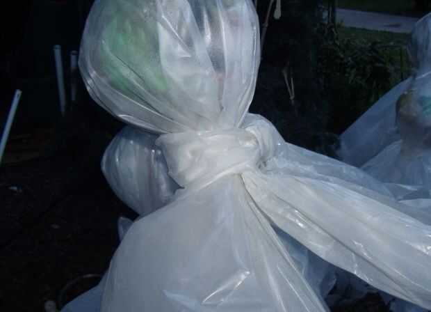 empujó la calabaza en el tubo y cubierta una hoja grande de plástico sobre ella, con otra tira de un pie de ancho