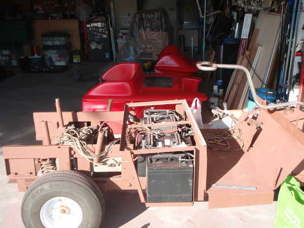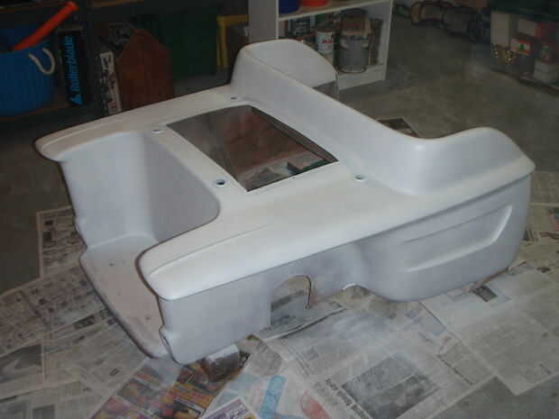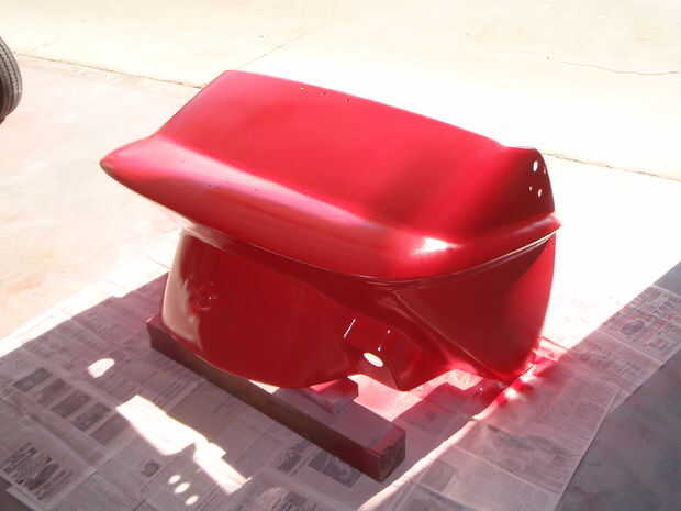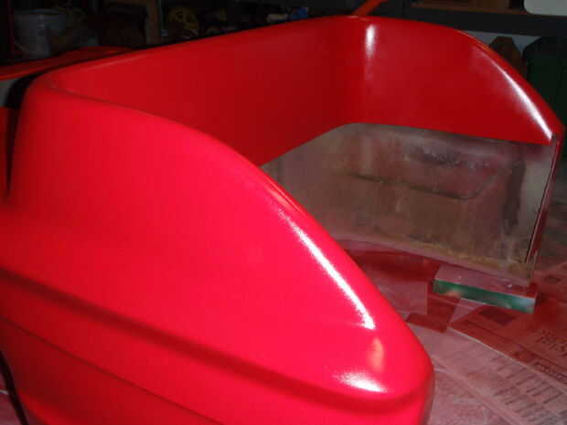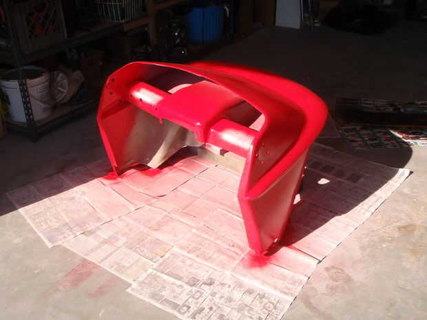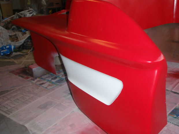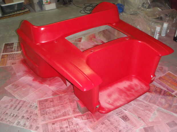 La parte de atrás de la mitad del carro utiliza tres latas del Primer blanco y después de esperar unos pocos días terminé para arriba con dos latas de la bandera roja. Pinté la rejilla de la tapa del motor con algunos restos pintura blanca que tenía alrededor. Para la mitad delantera del carro usé dos latas de la imprimación blanca, y después dejar que seque durante unos días más había cubierto con dos latas de la bandera roja.
