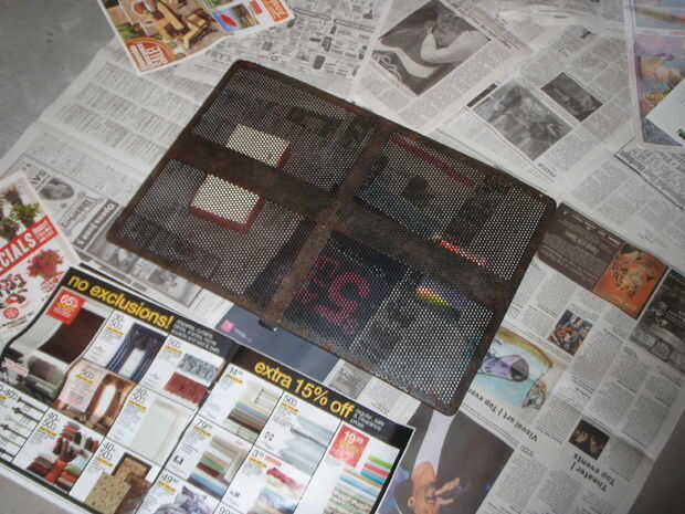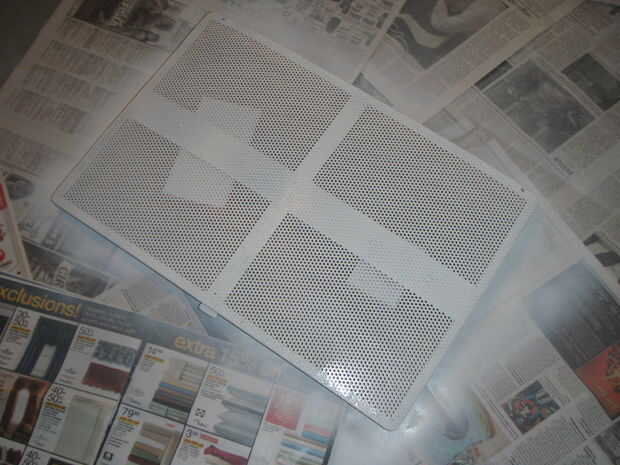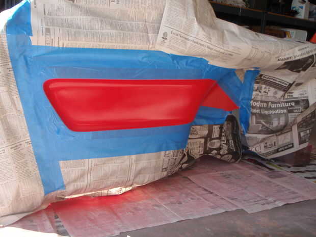 Aplicar las franjas con cinta las zonas a cada lado con cinta de pintor azul y luego establecer sobre que cubre el resto del carro con el periódico. He aplicado 2-3 capas con el satén blanco, y unas horas más tarde quita el periódico y la cinta.