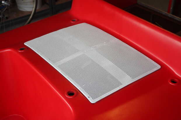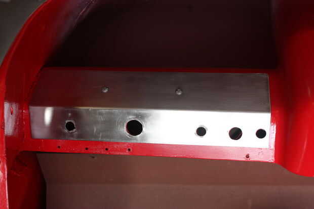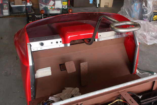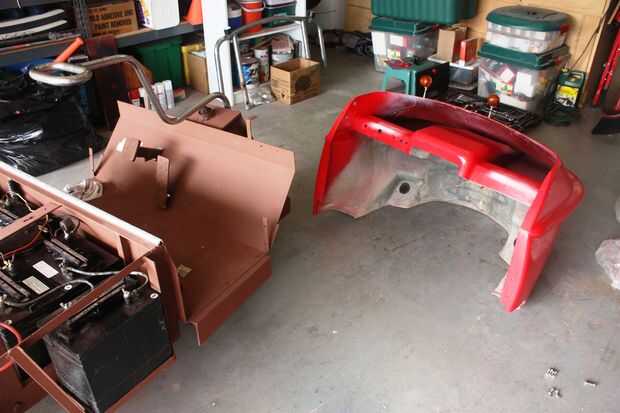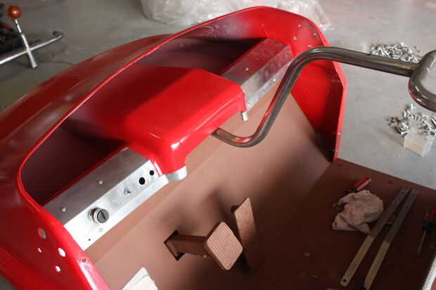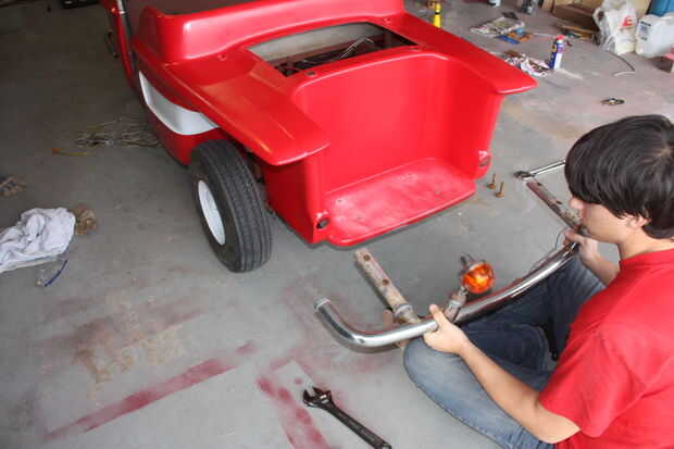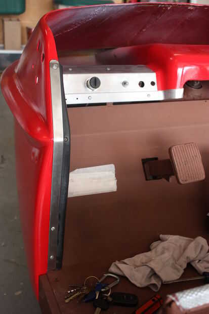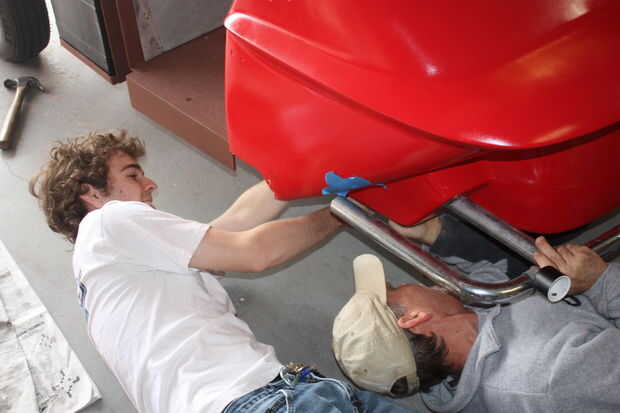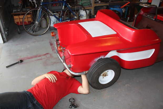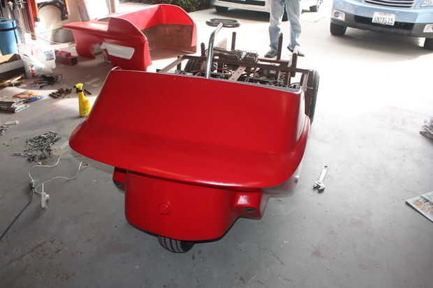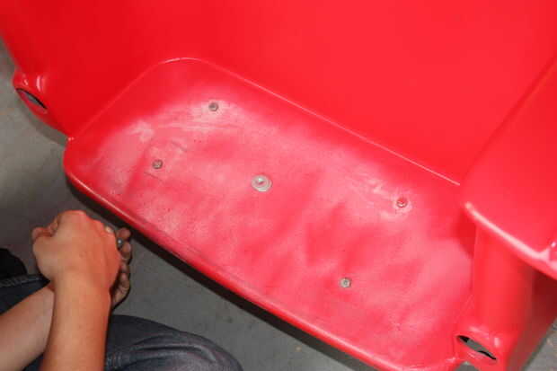 Instalación de back-end es un trabajo de tres personas. Tuvimos que inclinar detrás, a continuación, mover hacia adelante sobre las ruedas. Una vez que llegamos allí, tuvimos que montar dos aletas de fibra de vidrio en la parte delantera del asiento. Era un poco de un tramo, pero llegamos allí.