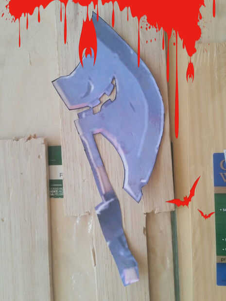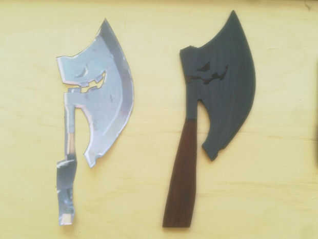 Ya que este jinete sin cabeza no caballo, él va a necesitar un arma. El equipo de fortaleza Jinete Decapitado sin lleva un hacha, conocido como el tomador de la cabeza. Tenía algunos madera de balsa de 1/4" poner alrededor, así fue mi material de elección. A la vista trasera, esto habría sido un buen candidato para la creación de un archivo vectorial capaz de escala gráfica o .svg para cortar el eje hacia fuera en el epílogo Makerspace cortador del laser. En su lugar utilicé una herramienta rotozip para dirigir los cortes ásperos y una lijadora a afinar los bordes. Me preocupaba con el partir madera balsa, por lo que opté por dibujar en la mueca malhumorada y los ojos en vez de cortarlo hacia fuera.
