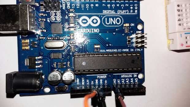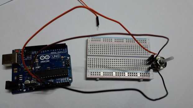 Hay 3 polos (izquierda, centro, derecha). La conexión del centro es un limpiador que se mueve de un extremo al otro, dándole un rango de resistencia muy baja (alrededor de 1-50 ohmios dependiendo de la tolerancia y la calidad de la olla) a alrededor de 5 K o 10 K ohmios cuando se mide entre el 'limpiador' de centro y la izquierda o derecha. En uno de los tableros Coloque los pasadores de tu olla en filas 1, 3 y 5 (izquierda, derecha y centro) - el perno izquierdo irá a Gnd (negro) - centro el pin, se conectará a analógico 0 (A0) (marrón) - pin de la derecha se destinará a la alimentación de 5v (naranja)