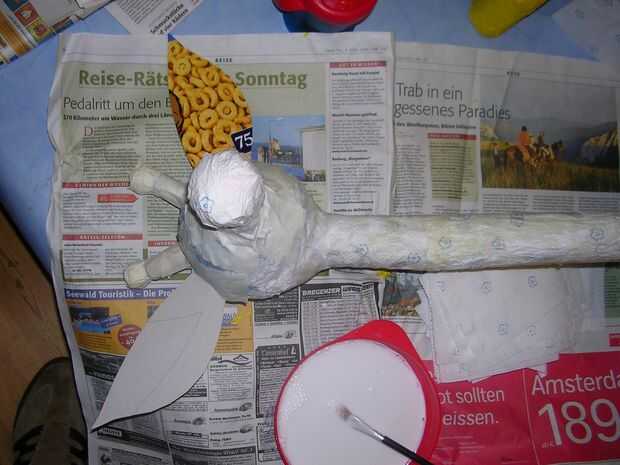 Unförmige Teile werden aus zusammengeknüllter Zeitung geformt und mit Tesafilm un ihrer posición fixiert, mit Küchentüchern umwickelt und gut mit dem Leim eingeschmiert.