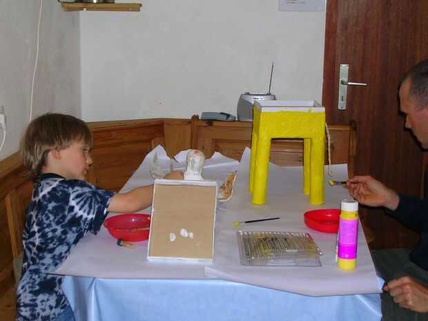 Da wir die als jirafa Verpackung für ein Geburtstagsgeschenk verwendet haben, nahmen wir für den Körper einen Schuhkarton. Hier sind wir beim schon Anmalen der Einzelteile.
