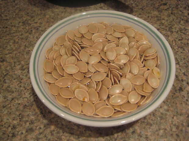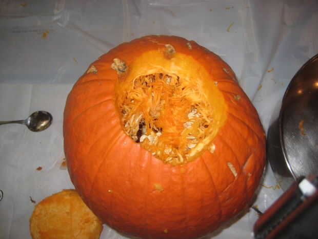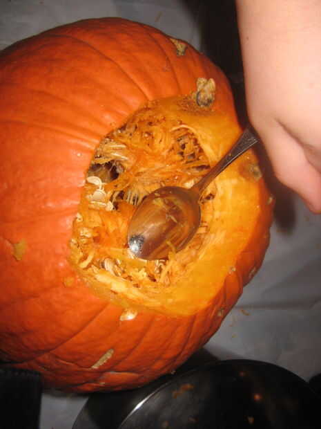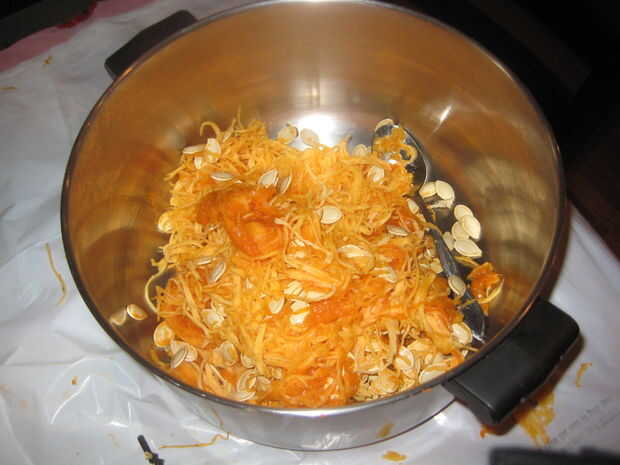 A continuación, utilizar la cuchara para quitar las tripas de calabaza y ponerlas en el recipiente.