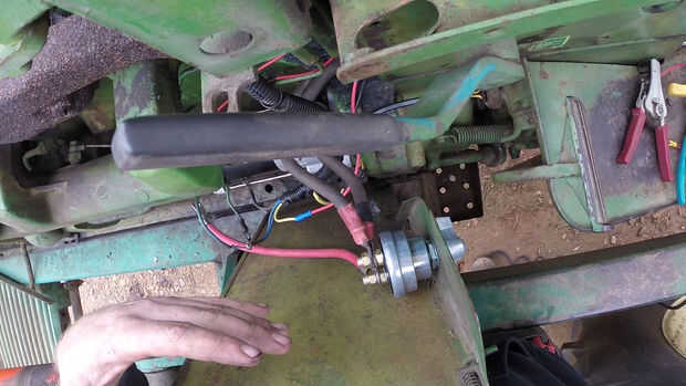 - Los cables marrón y azul que están cerca del motor de arranque deben ser conectados igualmente a la solenoide de arranque superior terminal. Nota que probablemente necesite poner un anillo nuevo terminal para el terminal. O usted podría hacer un puente terminal de alambre como lo hice.