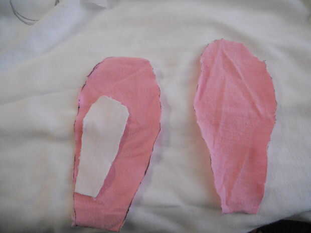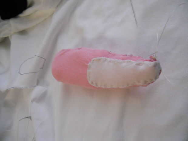 Tendrá que doble para arriba el patrón antes de empezar a coser. Para añadir embelishments como ojos o partes del oído debe coser directamente sobre una pieza del patrón antes de empezar a cosas. Aquí hay fotos del embelishment de oído antes de ser cosido en así como el oído relleno y acabado.