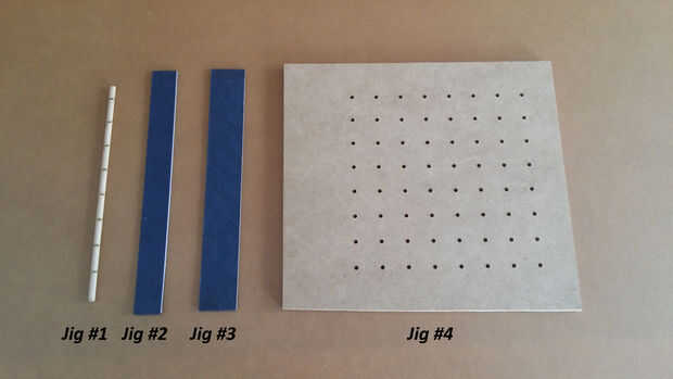 - JIG #4 es un tablero de madera formado por una matriz de 8 x 8 con orificios de 3mm de diámetro y 18mm aparte. Esta plantilla asegura los LEDs uniformemente espaciados y alineados.