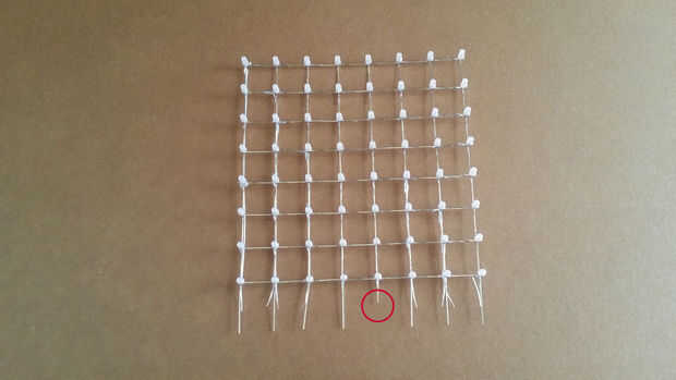 Paso 10 - soldadura todas las patas del ánodo a la PCB (coloque objetos adecuados como lápices como guías entre la fila más baja del cátodo y la placa para apoyar la matriz de LED a una distancia constante de la PCB).
