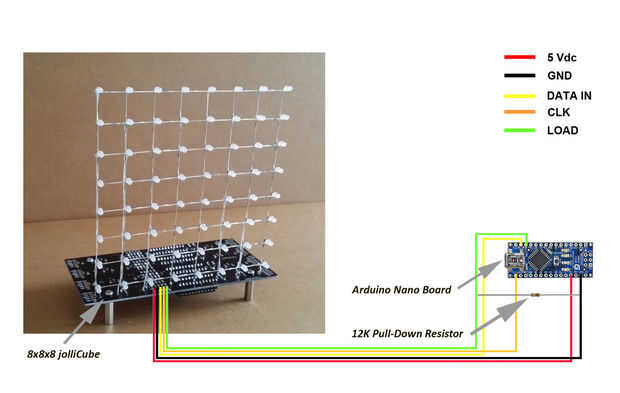 Se utilizó un Arduino Nano cargado con nuestro programa de test del cubo del LED para la prueba. Ver la foto de arriba para conectar el Arduino Nano para el PCB de cubo de LED.