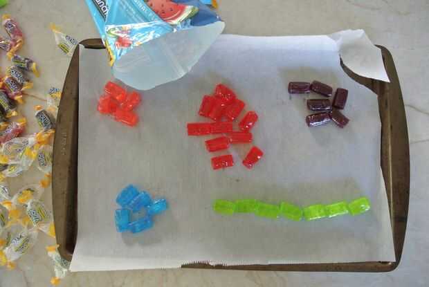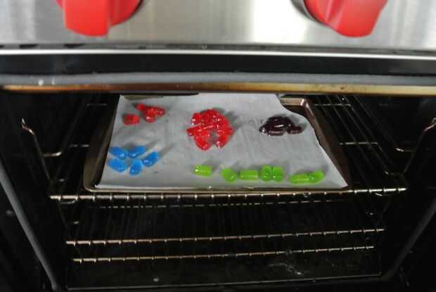Las rosas necesitan sólo un ingrediente, que es el caramelo duro. He utilizado alegres ganaderos porque tienen buen sabor y creo que se ven bastante cuando derretido. También puede utilizar otros caramelos duros - creo que rosas menta sería genial en invierno. Desenvuelva los rancheros jolly de colores deseados y coloque en una placa para horno cubierta con papel sulfurizado. Usé un total de cerca de 10 por flor, y 4 más para los tallos. Variará según cuántos pétalos pones en la flor. Les del derretimiento en un horno de 300 º durante unos minutos, alrededor de 4-5 o hasta se derritan.