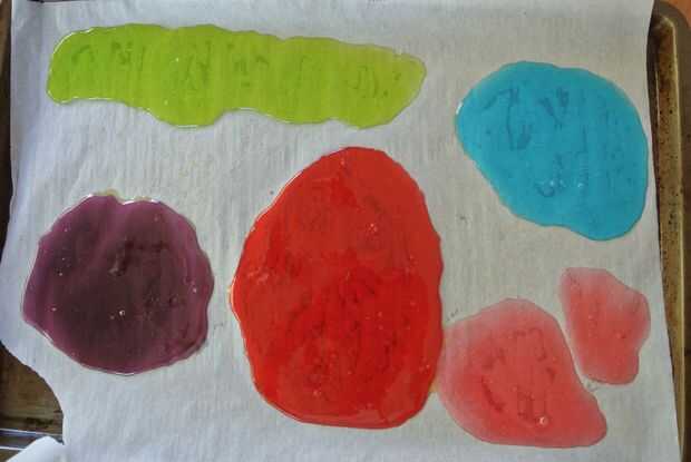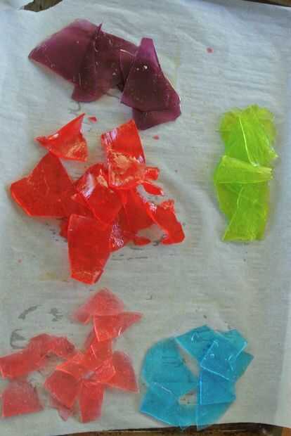 Espere a que el caramelo se enfríe. Después de un minuto o dos se puede decir que es bastante flexible y suave. Cuando el caramelo está totalmente endurecido, romperlo en pequeños trozos con las manos. Después de un poco de experimentación, he encontrado que una forma de arco iris hace un rosebud realmente bonito cuando, así que reordenar los fragmentos sobre la bandeja para hornear en forma de arco iris-tipo.