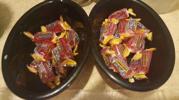Separar los sabores Jolly Rancher en los cinco tazones de fuente pequeños.